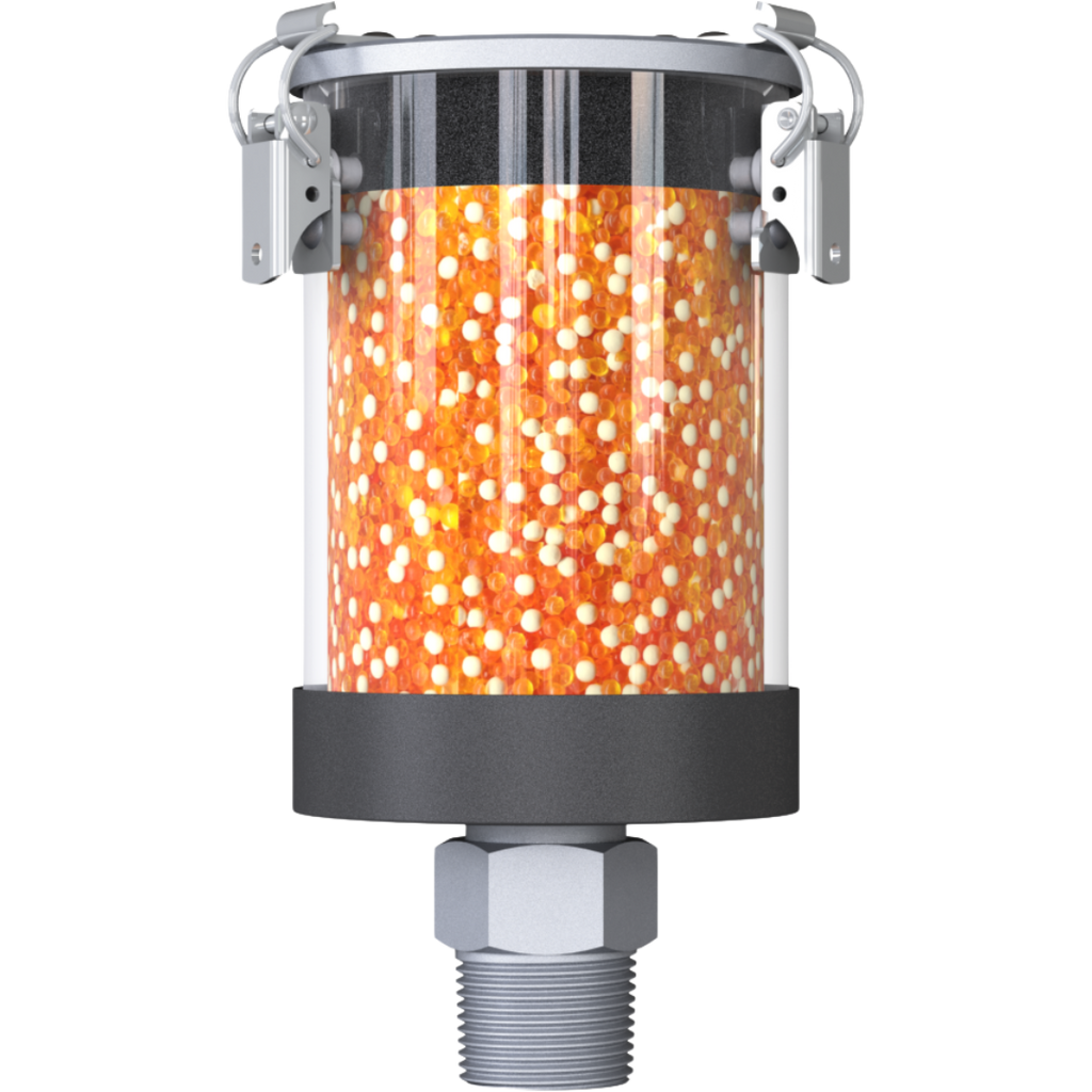 The Series VV-R Desiccant Breather Dryer is a refillable moisture protection solution designed for hydraulics, gears, barrels, IBCs, and mobile machinery in both indoor and outdoor environments. This dryer ensures constant air exchange with minimal downtime, safeguarding equipment against moisture damage. Its durable plastic housing is filled with GIEBEL Xdry desiccant and includes a 3μm filter for efficient air drying and cleaning. An activated carbon layer adsorbs oil mist to protect the desiccant and environment from contamination. When the desiccant reaches saturation, the inner components can be replaced at a low cost, making the system cost-effective and easy to maintain. The refillable design reduces waste while providing long-lasting, reliable protection.